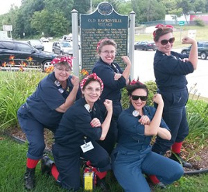 Put together your costume ahead of time. It’s easy. All you need are dark blue jeans and shirt (or coveralls) and brown or black shoes or boots. If you need help with the red socks and a red polka-dot bandana, the RTR Trust will have Rosie Rally Packs on hand that you can purchase. This Rosie Rally Resource Guide will help you further.