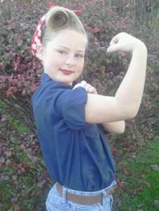 My 11-year-old budding civil activist daughter spent her own 10 dollars at a fair a few months ago on a ‘We Can Do It’ metal sign. She was already aware of Rosie and had mentioned wanting such a poster. After her purchase she soon decided that was who she wanted to be for Halloween. I’ve attached a picture of her from Halloween night wearing the bandana we got through you. I thought it was such a good picture that I had to share!