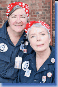 With several trips to Army surplus stores, we were able to recreate my dad’s uniform, which he wore proudly as he mingled and exchanged war stories with other veterans. My sister Lynn, dressed as a forties band singer when she performed, took pride in wearing the tailored suits my mother wore. My sister Janet and I dressed as Rosie the Riveter. We wore mock I.D. badges from Richmond Engineering using our mom’s name and a photo of her on our uniform as if we were our mother for the day.